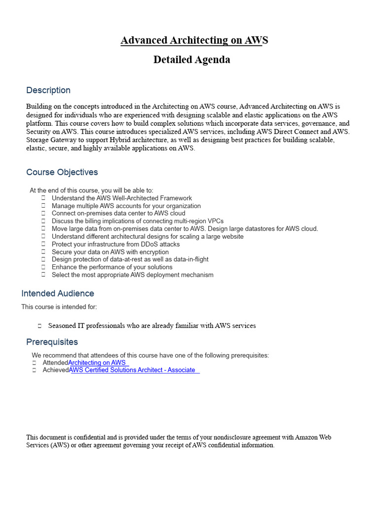 Building on the concepts introduced in the Architecting on AWS course, Advanced Architecting on AWS is