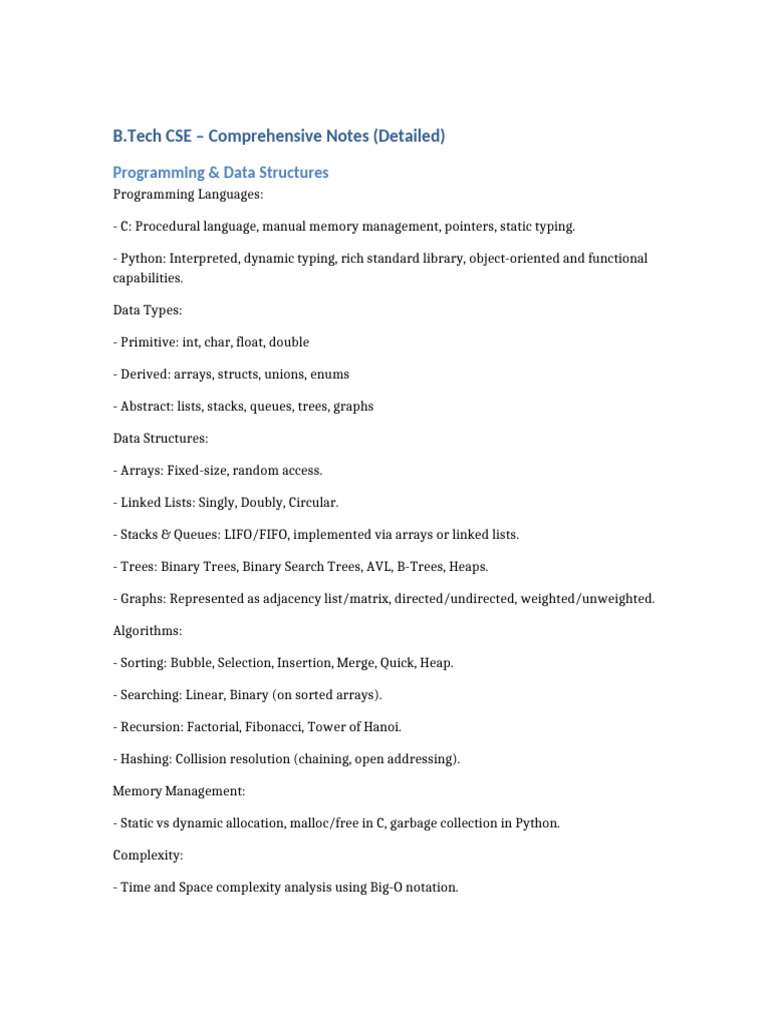 - Graphs: Represented as adjacency list/matrix, directed/undirected, weighted/unweighted.