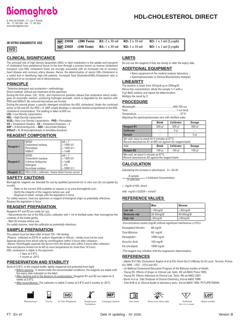 The principal role of high density lipoprotein (HDL) in lipid metabolism is the uptake and transport Do not use the reagents if they are cloudy or after the expiry date.