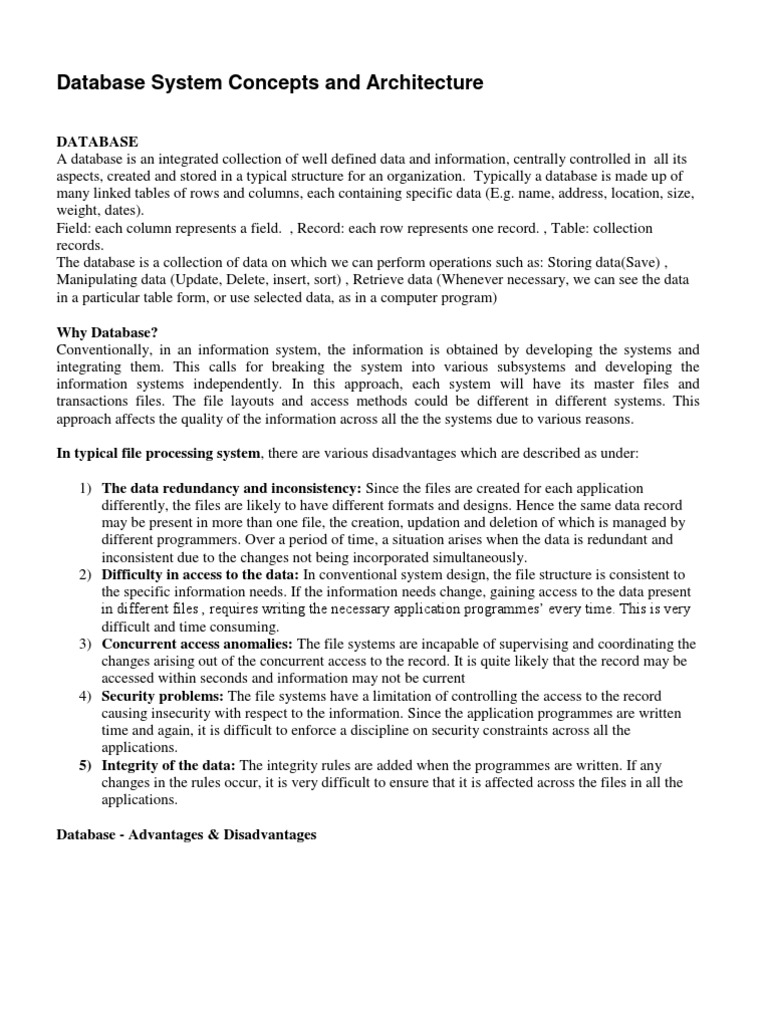 DATABASE A database is an integrated collection of well defined data and information, centrally controlled in all its aspects, created and stored in a typical structure for an organization. Typically a database is made up of many linked tables of rows and columns, each containing specific data (E.g. name, address, location, size, weight, dates). Field: each column represents a field. , Record: each row represents one record. , Table: collection records. The database is a collection of data on which we can perform operations such as: Storing data(Save) , Manipulating data (Update, Delete, insert, sort) , Retrieve data (Whenever necessary, we can see the data in a particular table form, or use selected data, as in a computer program) Why Database? Conventionally, in an information system, the information is obtained by developing the systems and integrating them. This calls for breaking the system into various subsystems and developing the information systems independently. In this approach, each system will have its master files and transactions files. The file layouts and access methods could be different in different systems. This approach affects the quality of the information across all the the systems due to various reasons. In typical file processing system, there are various disadvantages which are described as under: 1) The data redundancy and inconsistency: Since the files are created for each application differently, the files are likely to have different formats and designs. Hence the same data record may be present in more than one file, the creation, updation and deletion of which is managed by different programmers. Over a period of time, a situation arises when the data is redundant and inconsistent due to the changes not being incorporated simultaneously. 2) Difficulty in access to the data: In conventional system design, the file structure is consistent to the specific information needs. If the information needs change, gaining access to the data present in different files , requires writing the necessary application programmes every time. This is very difficult and time consuming. 3) Concurrent access anomalies: The file systems are incapable of supervising and coordinating the changes arising out of the concurrent access to the record. It is quite likely that the record may be accessed within seconds and information may not be current 4) Security problems: The file systems have a limitation of controlling the access to the record causing insecurity with respect to the information. Since the application programmes are written time and again, it is difficult to enforce a discipline on security constraints across all the applications. 5) Integrity of the data: The integrity rules are added when the programmes are written. If any changes in the rules occur, it is very difficult to ensure that it is affected across the files in all the applications. Database - Advantages & Disadvantages