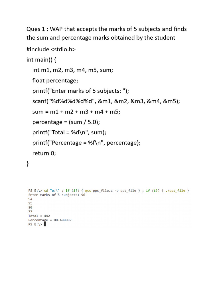 Ques 1 : WAP that accepts the marks of 5 subjects and finds