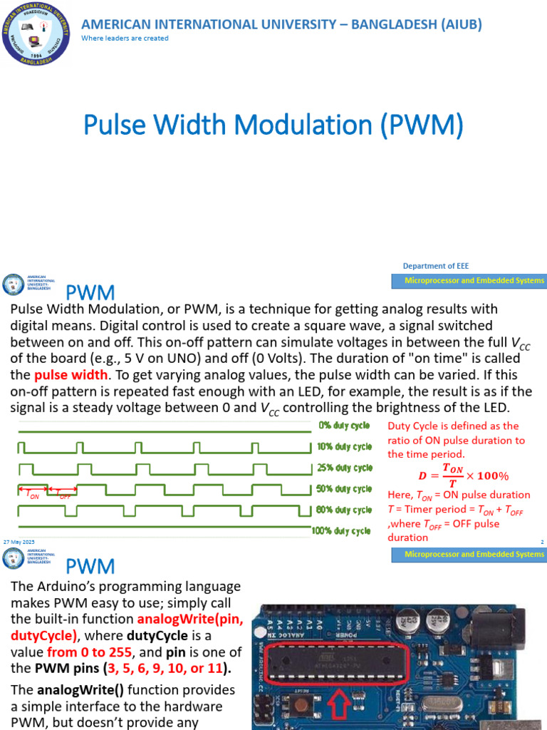 of the board (e.g., 5 V on UNO) and off (0 Volts). The duration of "on time" is called