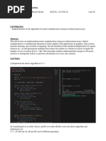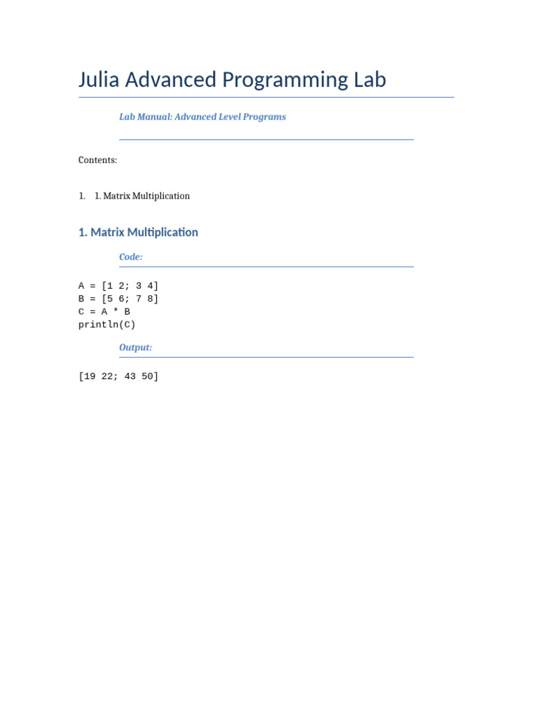 The document is a lab manual for advanced programming in Julia, specifically focusing on matrix multiplication. It provides a code example that multiplies two matrices, A and B, and displays the resulting matrix C. The output of the multiplication is shown as [19 22; 43 50].