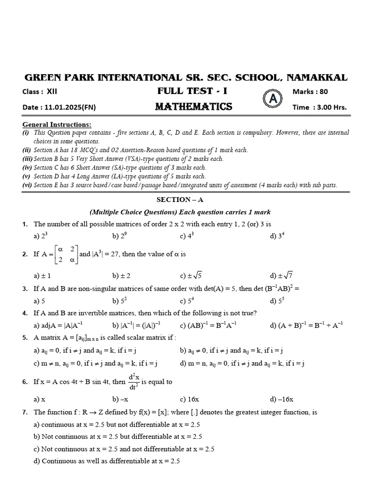 Date : 11.01.2025(FN) MATHEMATICS Time : 3.00 Hrs.