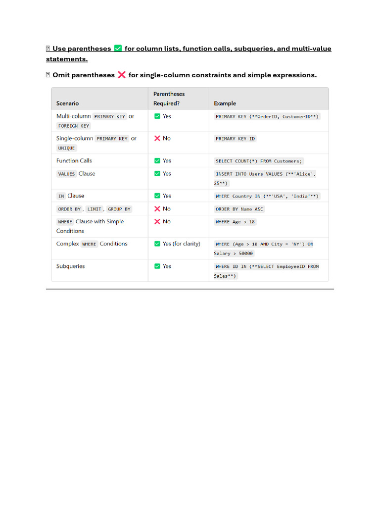 Use parentheses for column lists, function calls, subqueries, and multi-value