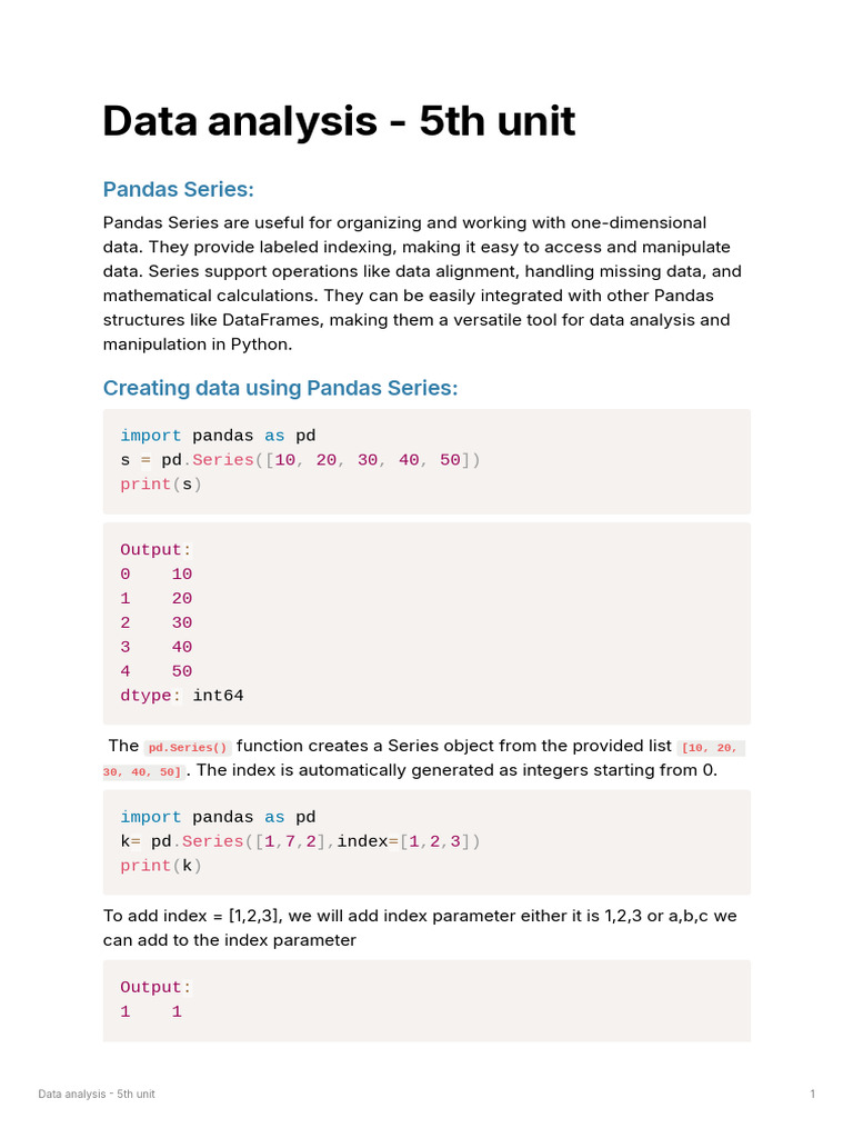 This code creates a Pandas Series res with values [1, 2, 3, 4] and custom