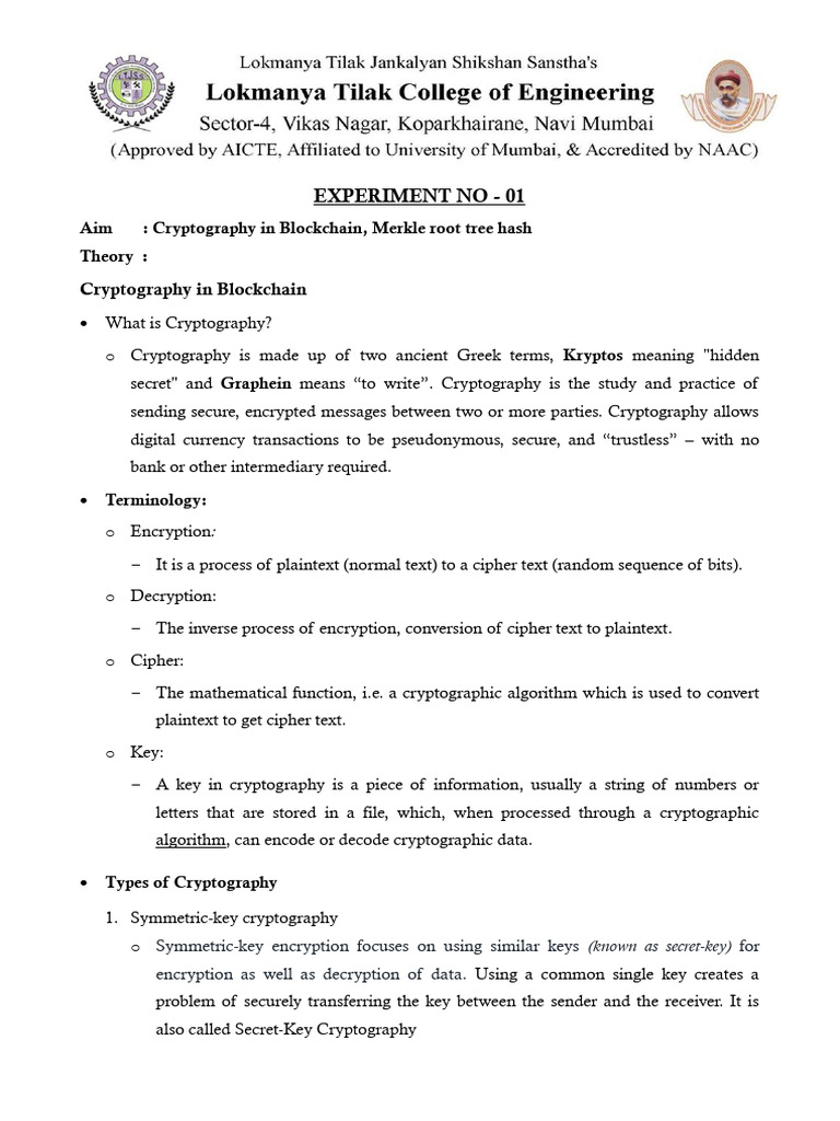 Aim : Cryptography in Blockchain, Merkle root tree hash