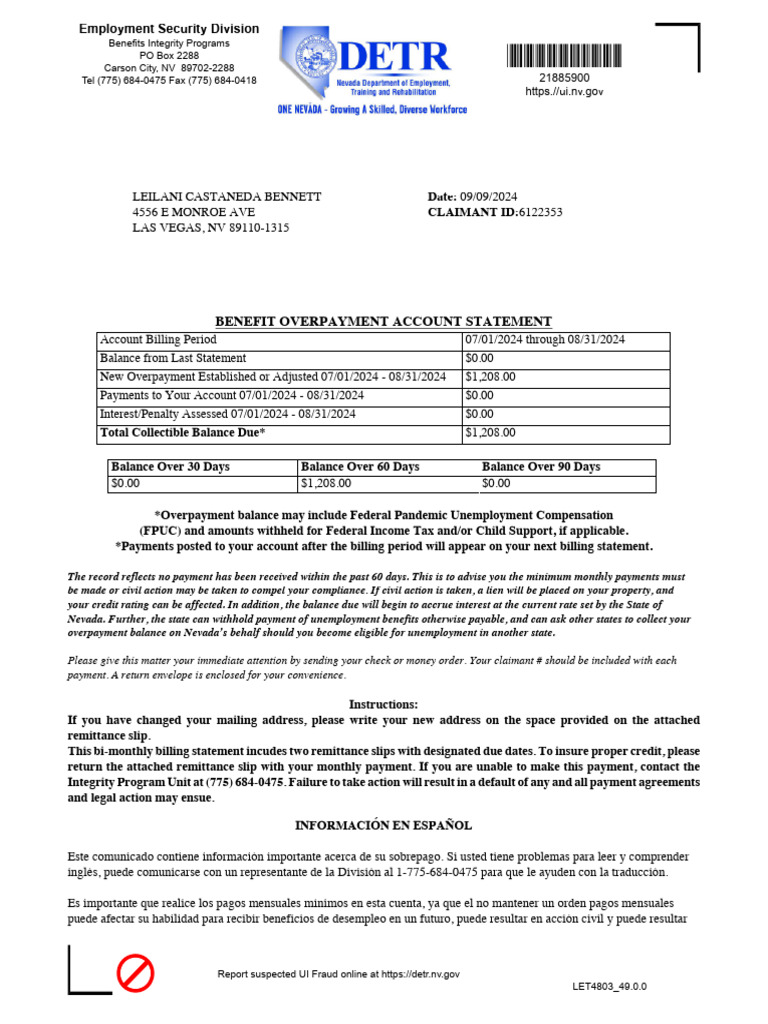 FRAUD Report suspected UI Fraud online at https://detr.nv.gov *LET4803*