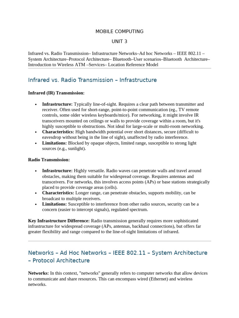 Infrared vs. Radio Transmission– Infrastructure Networks–Ad hoc Networks – IEEE 802.11 –