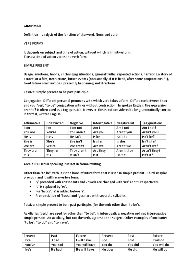 . VERB FORMS It depends on subject and time of action, without which is infinitive form. Tenses: time of action varies the verb form. SIMPLE PRESENT Usage: emotions, habits, unchanging situations, general truths, repeated actions, narrating a story of a novel or a film, instructions, future events (occasionally, if it is fixed, after some conjunctions *1), fixed future constructions, presently happening and directions. Passive: simple present to be past participle. Conjugation: Different personal pronouns with which verb takes a form. Difference between thou and you. Verb to be conjugation with or without contraction. In spoken English, the expression aren't I? is often used as a tag question. However, this is not considered to be grammatically correct in formal, written English. Affirmative I am You are He is She is We are They are It is Constricted Im Youre Hes Shes Were Theyre Its Negative I am not You arent He isnt She isnt We arent They arent It isnt Interrogative Am I Are you Is he Is she Are we Are they Is it Negative Int Am I not Arent you Isnt he Is she Arent we Arent they Isnt it Tag questions Am I not? Arent you? Isnt he? Isnt she? Arent we? Arent they? Isnt it?