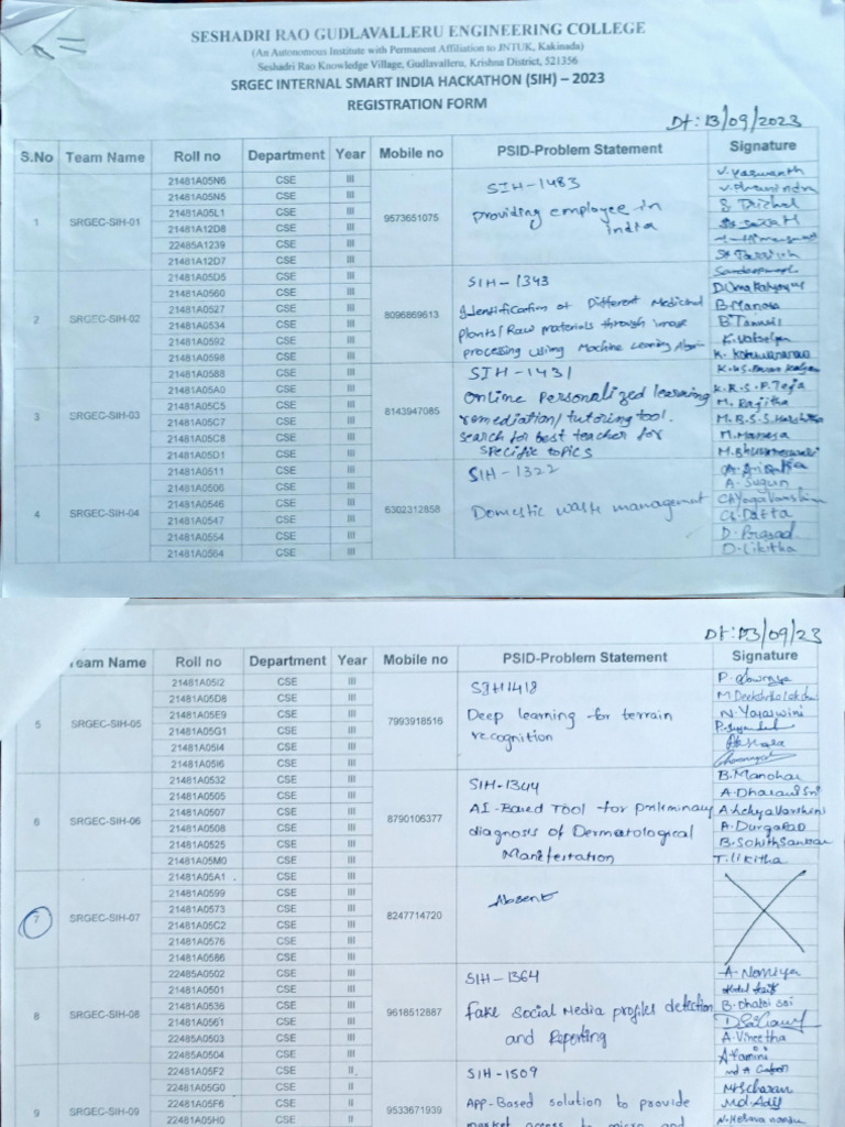 5.No| Team Name| Rollo | Department| Year| Mobile no PSID-Problem Statement ‘Signature