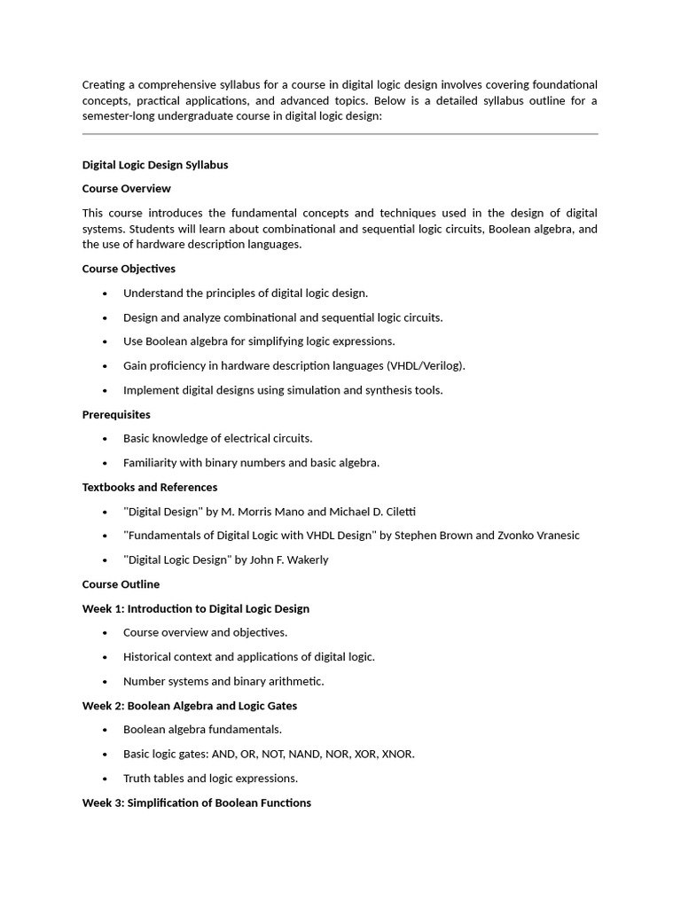 Creating a comprehensive syllabus for a course in digital logic design involves covering foundational