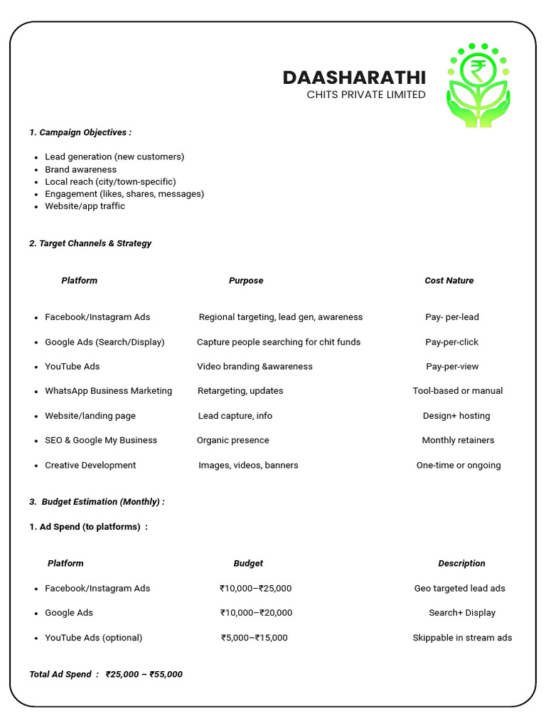Total Monthly Campaign Cost : ₹55,000 / month One -Time Setup ( Landing Page ) : ₹6,000