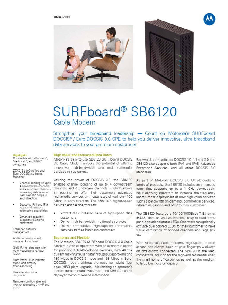 Utilizing the power of DOCSIS 3.0, the SB6120 As part of Motorola DOCSIS 3.0 Ultra-Broadband