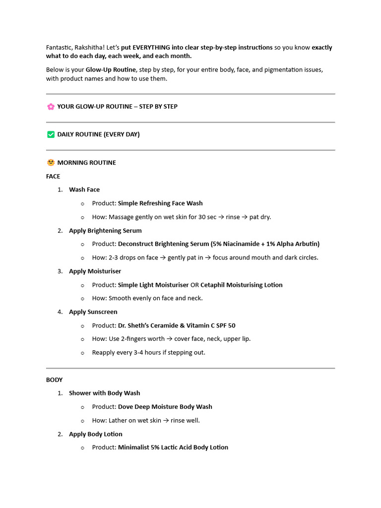 Below is your Glow-Up Routine, step by step, for your entire body, face, and pigmentation issues,