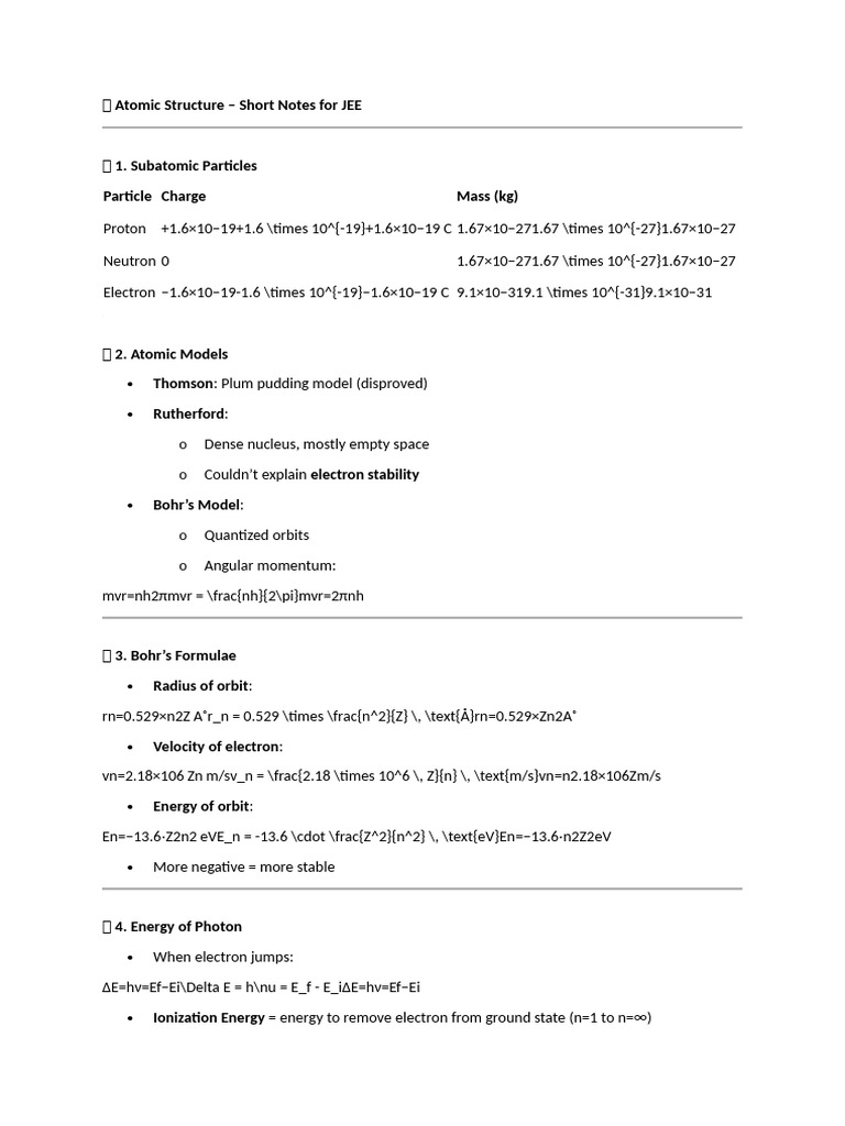 🧪 Atomic Structure – Short Notes for JEE