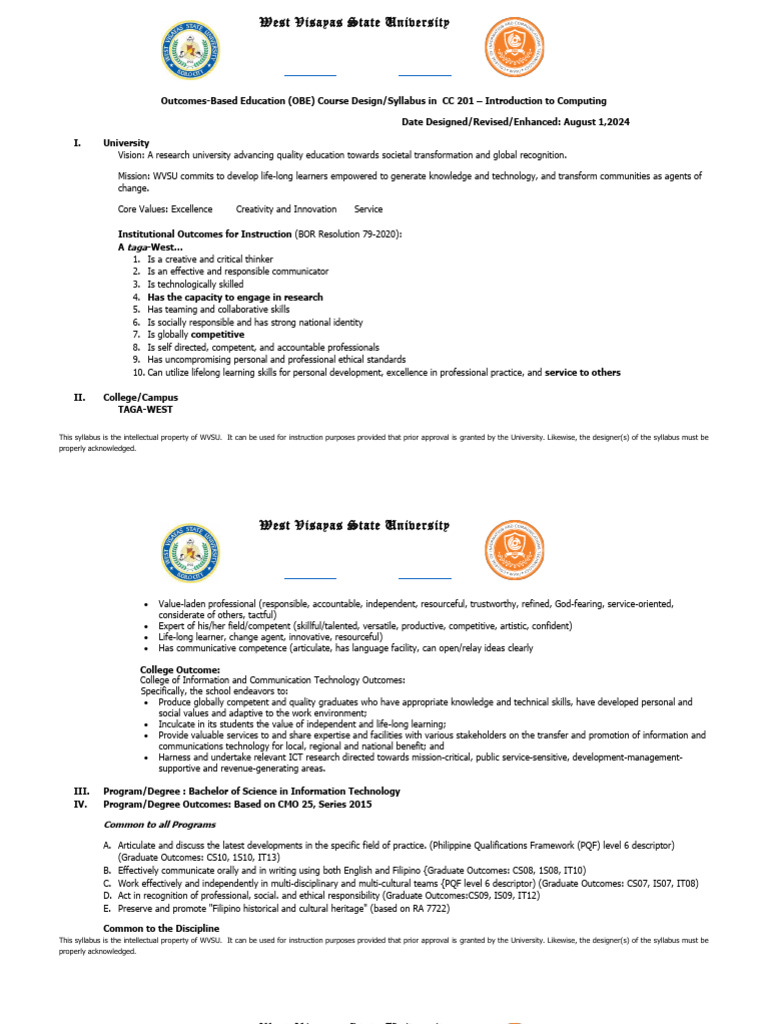 This syllabus is the intellectual property of WVSU. It can be used for instruction purposes provided that prior approval is granted by the University. Likewise, the designer(s) of the syllabus must be