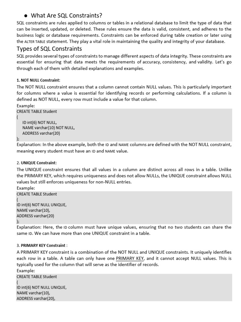 ● Unique Constraint: Ensures that all values in a column are different, preventing duplicate entries. While similar to