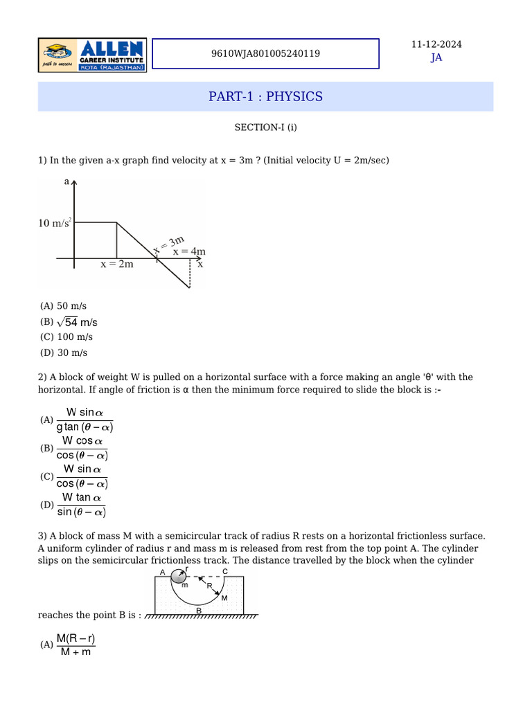 1) In the given a-x graph find velocity at x = 3m ? (Initial velocity U = 2m/sec)