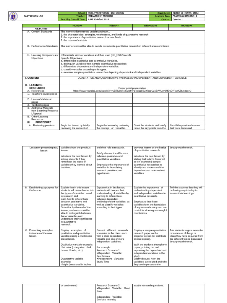 DAILY LESSON LOG Teacher: MEDIATRIX V. TRINIDAD Learning Area: PRACTICAL RESEARCH 2