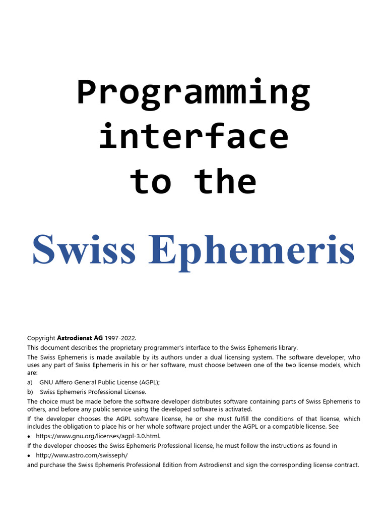 This document describes the proprietary programmer's interface to the Swiss Ephemeris library.