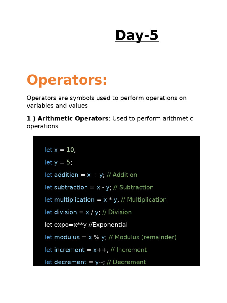 1 ) Arithmetic Operators: Used to perform arithmetic