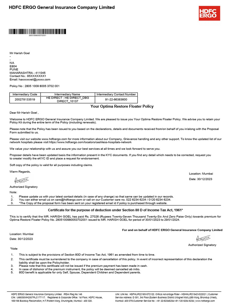 Optima Restore Floater Policy No. 2805100980053702001 issued to MR. HARISH GOEL for period of 30/01/2023 to 29/01/2024.