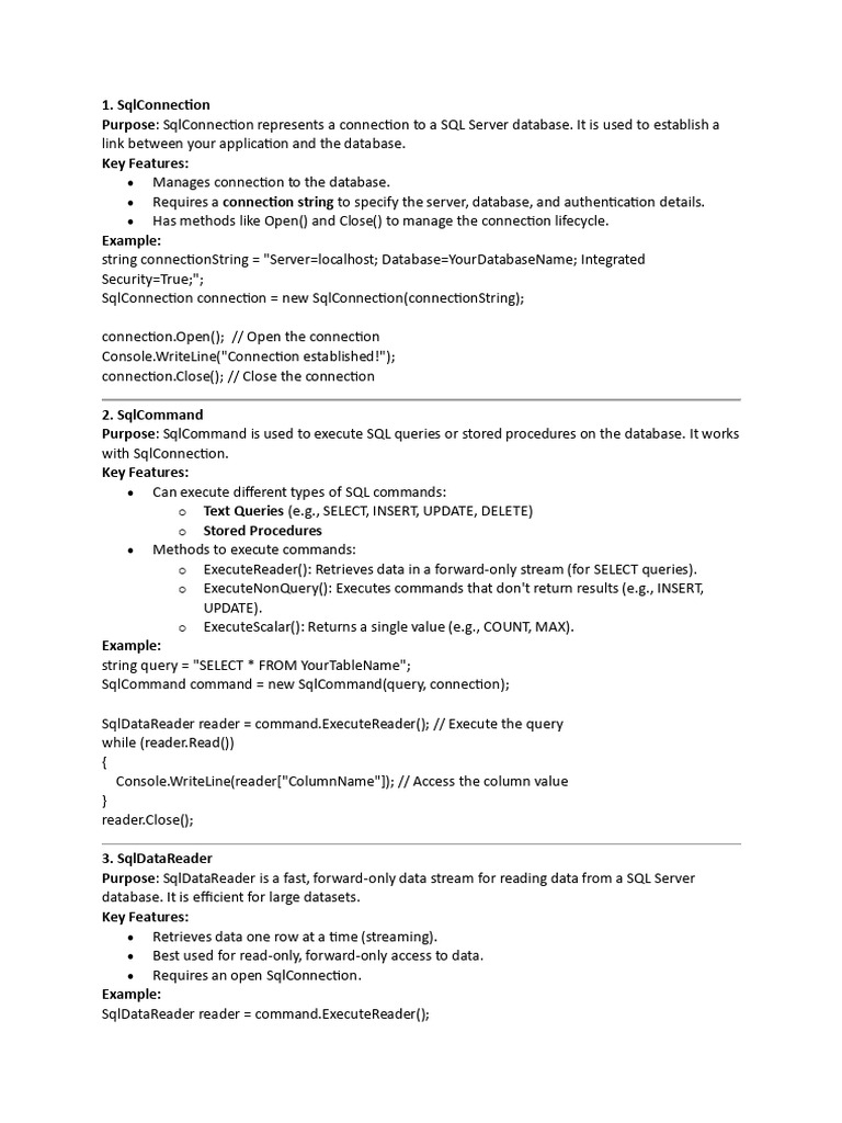 • SqlCommand: Use for executing SQL queries or stored procedures.