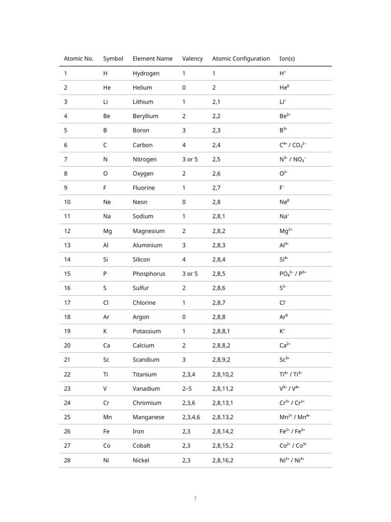 Atomic No. Symbol Element Name Valency Atomic Configuration Ion(s)