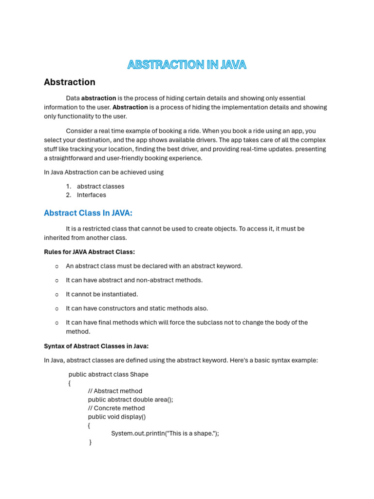 In this example, Shape is an abstract class with one abstract method area() and one concrete