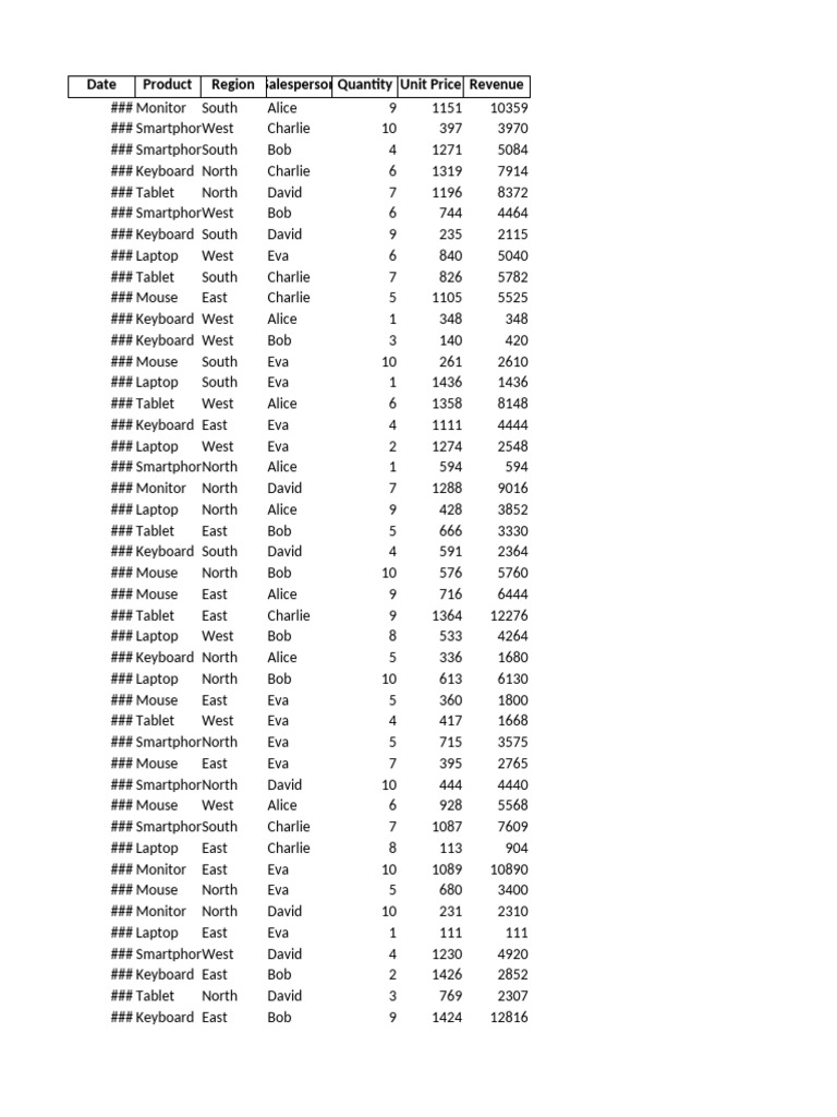 Date Product Region SalespersonQuantity Unit Price Revenue