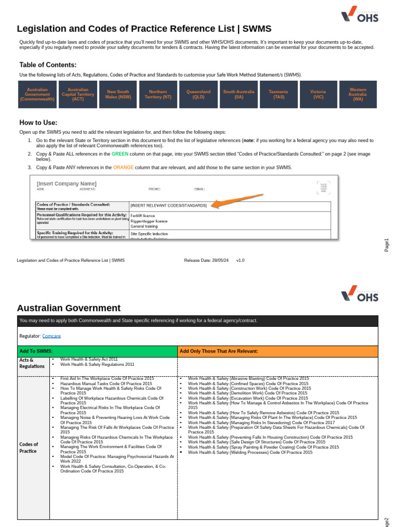 Legislation and Codes of Practice Reference List | SWMS Release Date: 28/05/24 v1.0