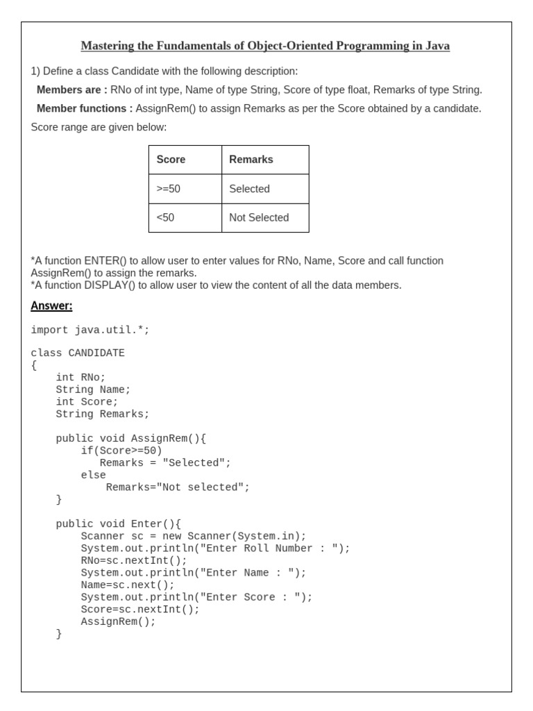 Member functions : AssignRem() to assign Remarks as per the Score obtained by a candidate.