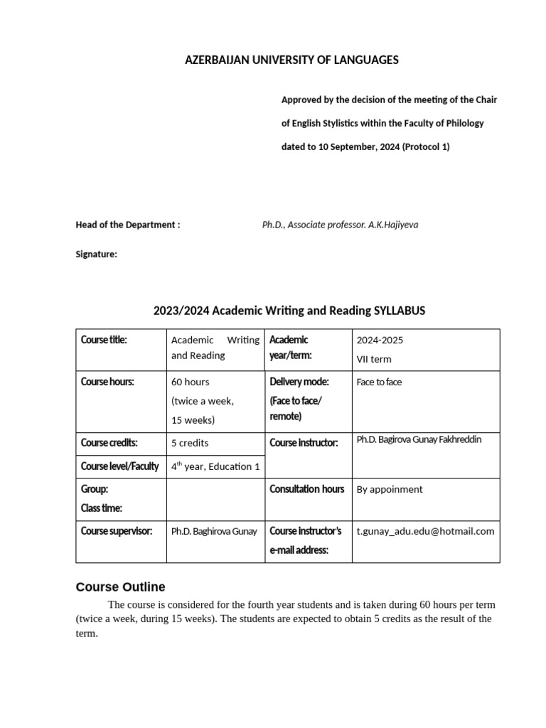 Course supervisor: Ph.D. Baghirova Gunay Course instructor’s t.gunay_adu.edu@hotmail.com