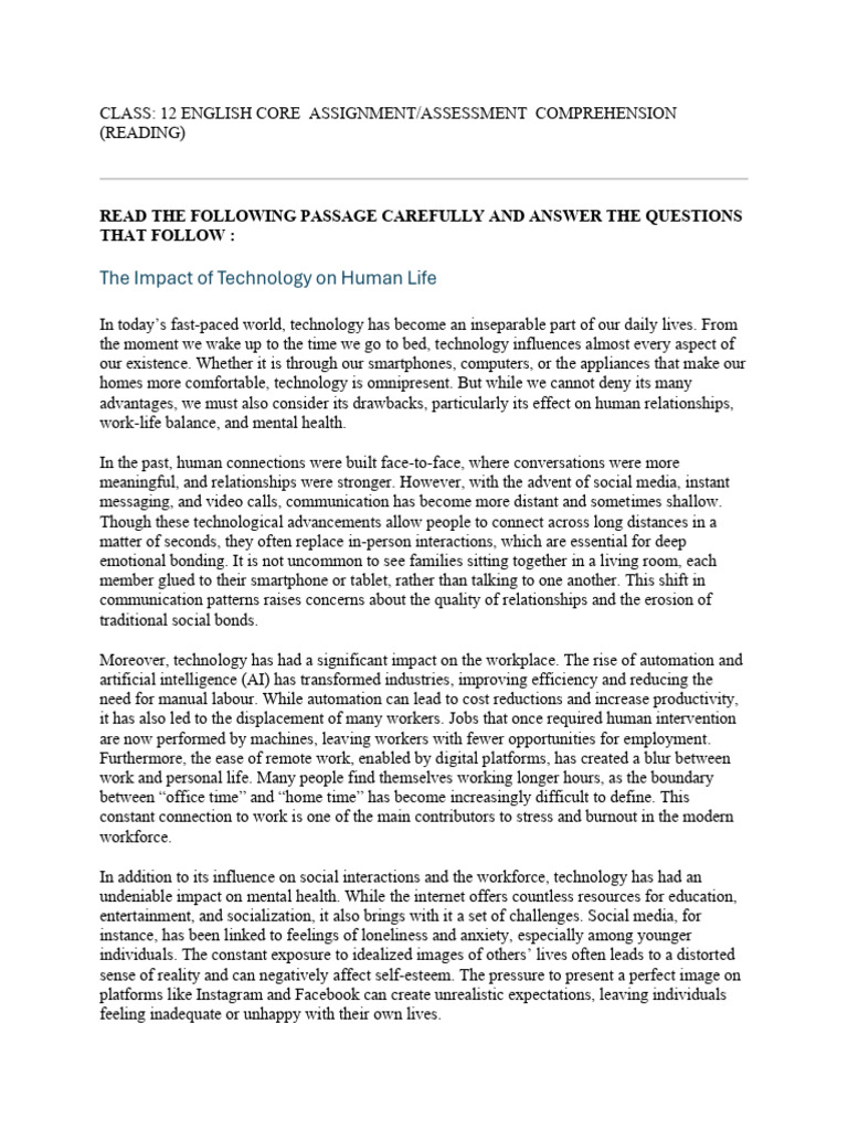 CLASS: 12 ENGLISH CORE ASSIGNMENT/ASSESSMENT COMPREHENSION