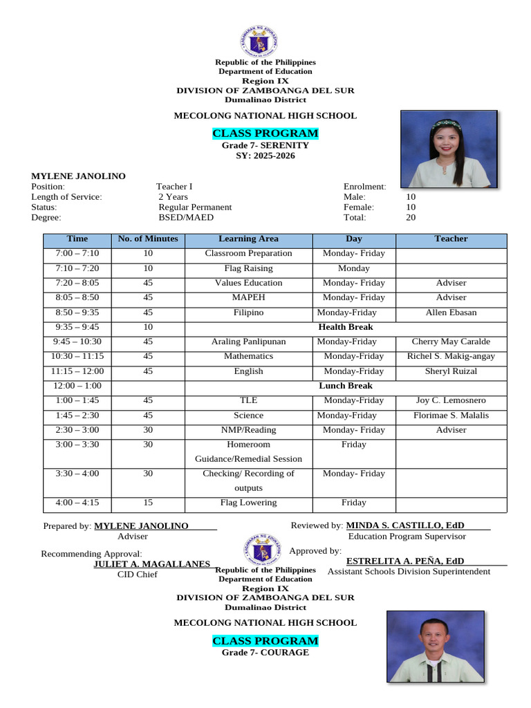 Time No. of Minutes Learning Area Day Teacher
