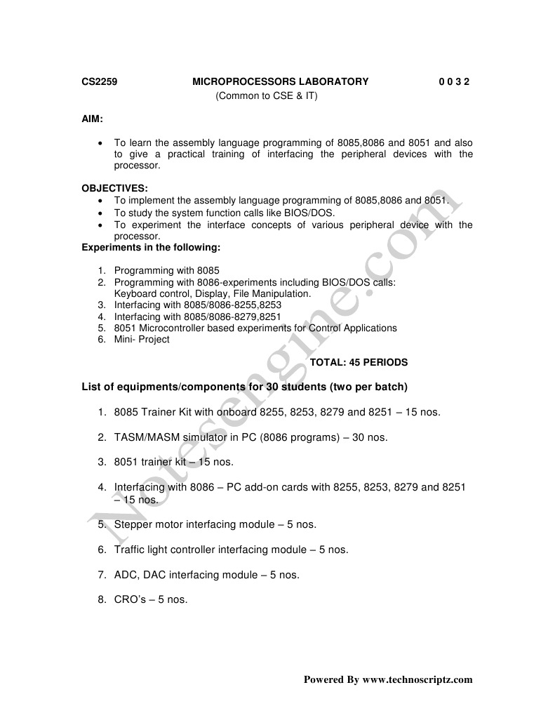OBJECTIVES: To implement the assembly language programming of 8085,8086 and 8051. To study the system function calls like BIOS/DOS. To experiment the interface concepts of various peripheral device with the processor. Experiments in the following: 1. Programming with 8085 2. Programming with 8086-experiments including BIOS/DOS calls: Keyboard control, Display, File Manipulation. 3. Interfacing with 8085/8086-8255,8253 4. Interfacing with 8085/8086-8279,8251 5. 8051 Microcontroller based experiments for Control Applications 6. Mini- Project TOTAL: 45 PERIODS