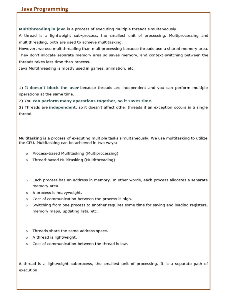 Multithreading in java is a process of executing multiple threads simultaneously.
