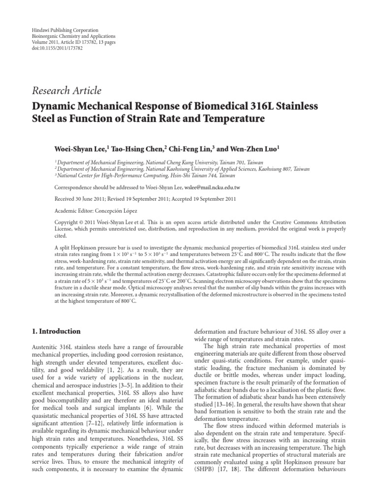 simulated body fluids,” Corrosion Science, vol. 53, no. 6, pp. [24] W. S. Lee and T. H. Chen, “Dynamic mechanical response