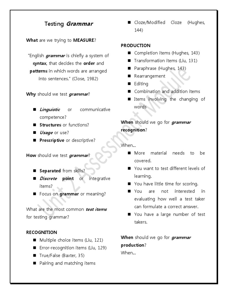 Completion items (Hughes, 143) Transformation items (Liu, 131) Paraphrase (Hughes, 143) Rearrangement Editing Combination and addition items Items involving the changing of words When should we go for grammar recognition? When More material needs to be covered. You want to test different levels of learning. You have little time for scoring. You are not interested in evaluating how well a test taker can formulate a correct answer. You have a large number of test takers. When should we go for grammar production? When