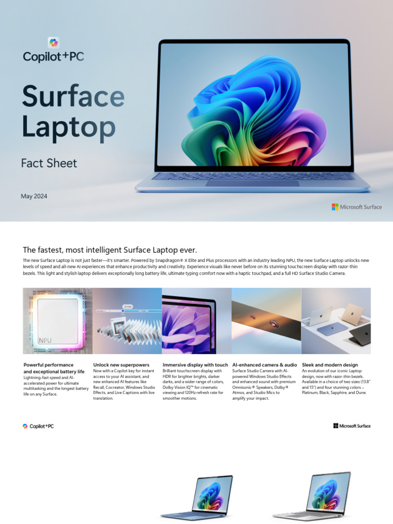 The new Surface Laptop is not just faster—it's smarter. Powered by Snapdragon® X Elite and Plus processors with an industry leading NPU, the new Surface Laptop unlocks new