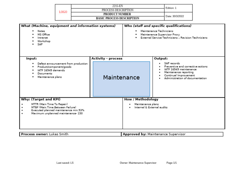 Last saved: LS Owner: Maintenance Supervisor Page 1/1