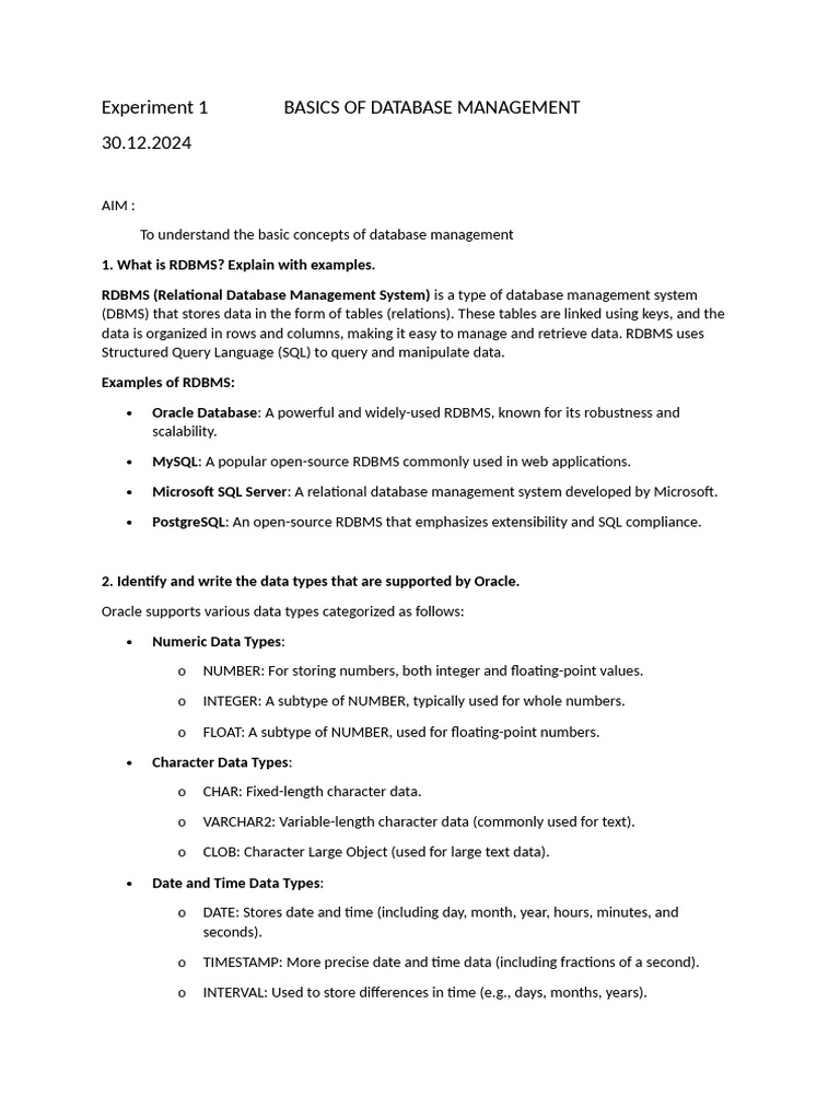 Experiment 1 BASICS OF DATABASE MANAGEMENT