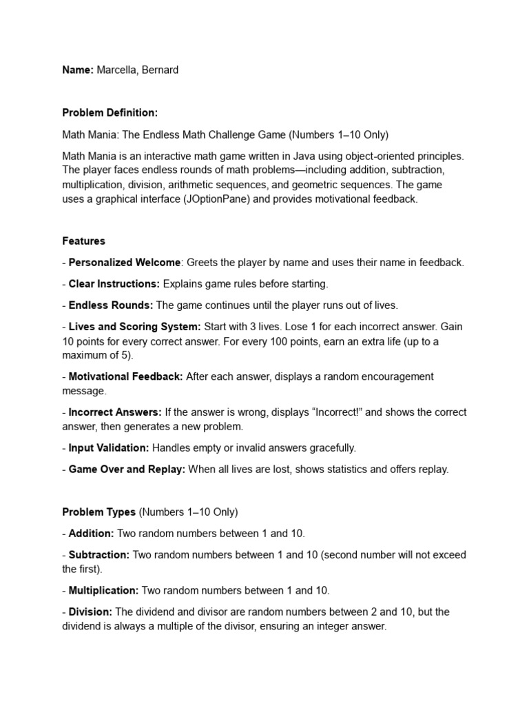 - MathManiaSystemMarcellaBernard.java: Handles math logic, scoring, feedback,