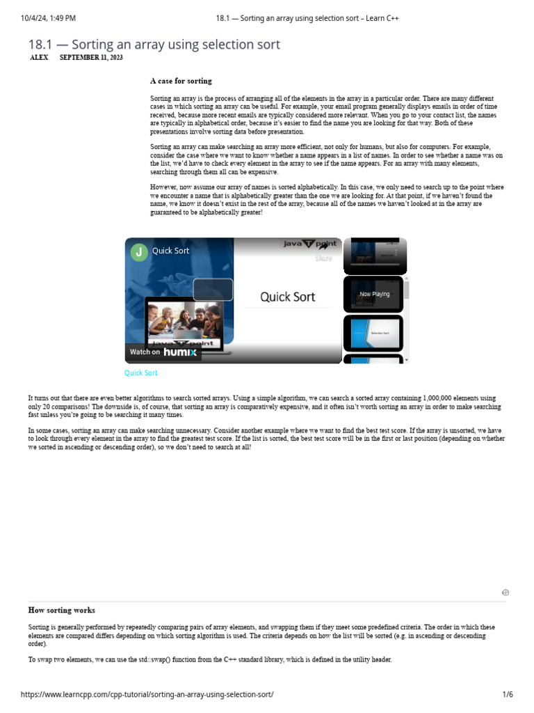 https://www.learncpp.com/cpp-tutorial/sorting-an-array-using-selection-sort/ 1/6