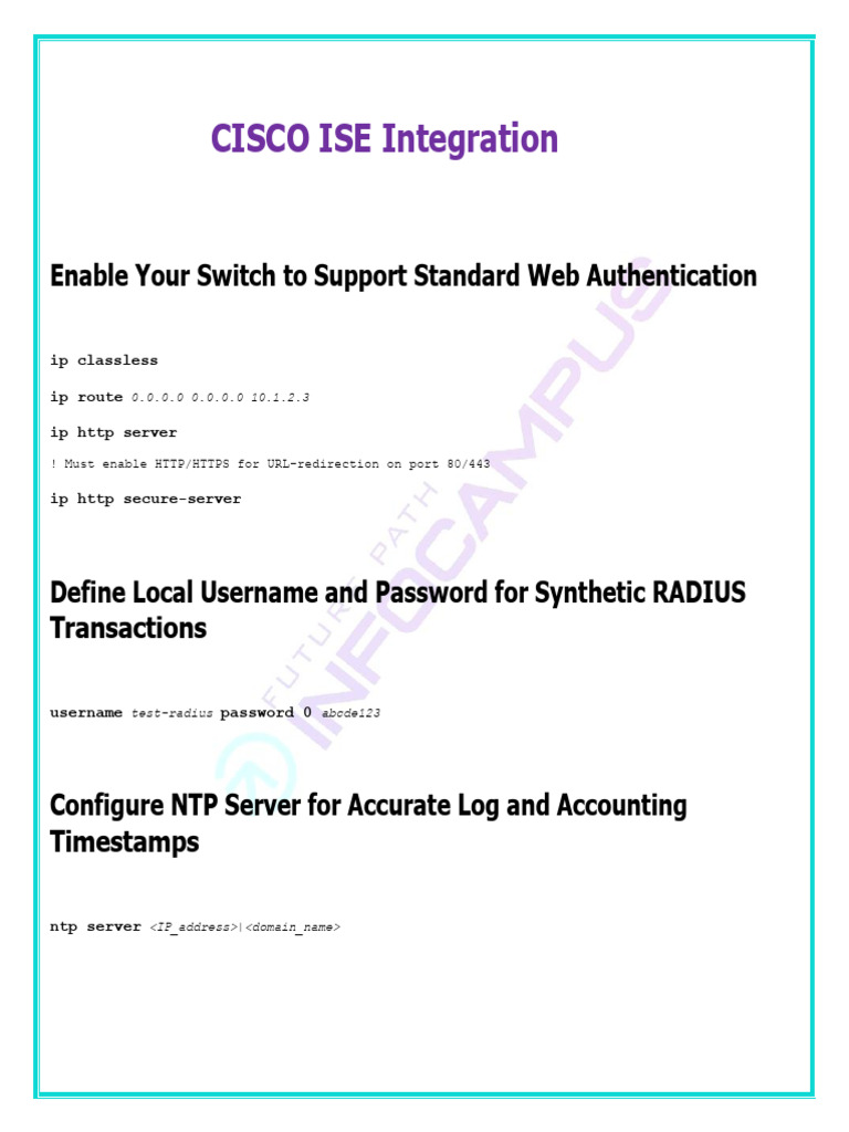 Configure the switch to interact with Cisco ISE as the RADIUS source server by entering the following