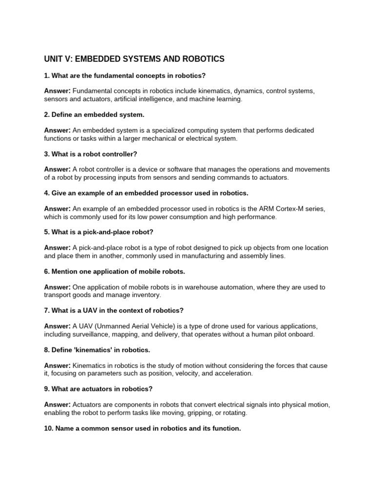 UNIT V: EMBEDDED SYSTEMS AND ROBOTICS