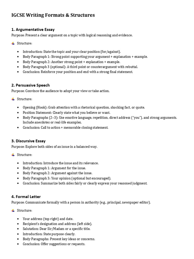 • Body Paragraphs (2–3): Develop points clearly with facts/opinions.