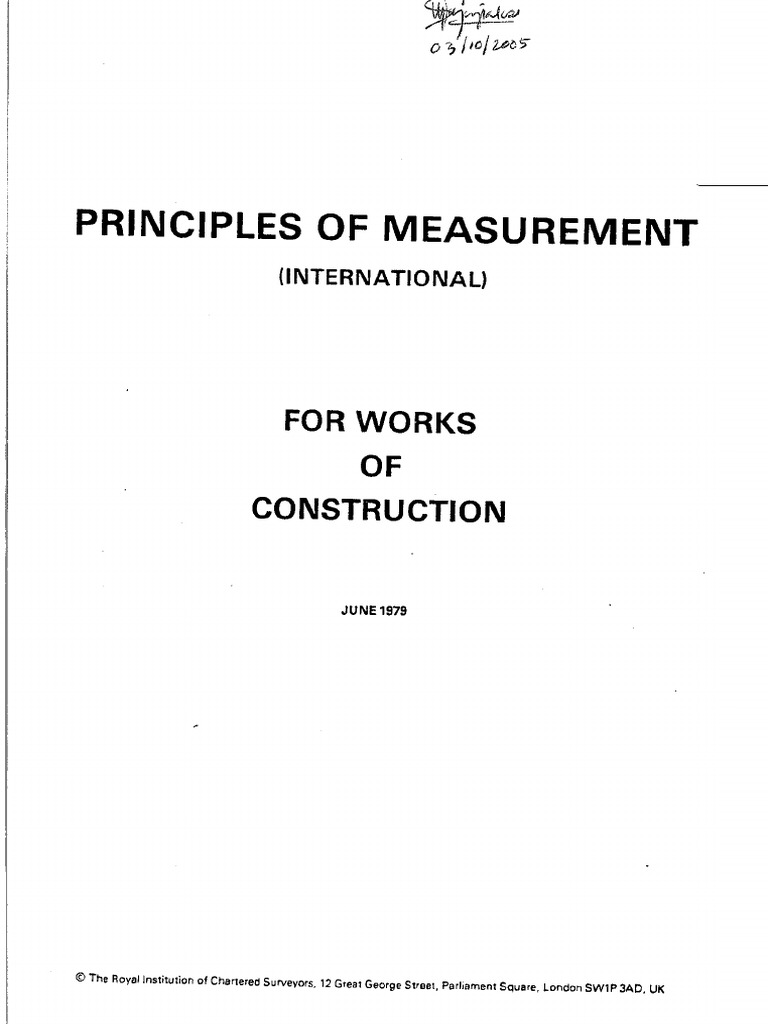 The document outlines the Principles of Measurement for construction works, established by The Royal Institution of Chartered Surveyors to standardize the preparation of bills of quantities and improve financial control in construction projects. It emphasizes the need for flexibility to accommodate varying practices across different countries and contracts. The principles cover various aspects of measurement, including the description of items, inclusivity of costs, and specific requirements for different types of work.