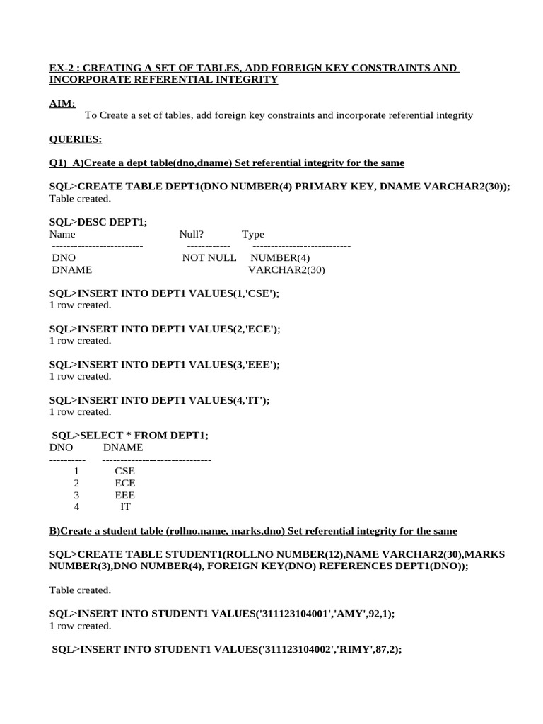 Q1) A)Create a dept table(dno,dname) Set referential integrity for the same